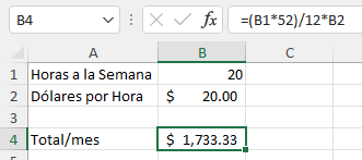 Si escribimos la f贸rmula en Excel:Resulta claro que no la empresa no puede permitirse este nivel de gasto mensual, y sin embargo esta persona resultar铆a una gran incorporaci贸n para la empresa. Para mejorar la propuesta, el 谩rea de reclutamiento se ha propuesto igualar el monto pretendido por el candidato de USD 20 / hora, pero reduciendo la cantidad de horas semanales, a fines de lograr al mismo tiempo alcanzar el objetivo financiero. Por lo tanto:1. La celda cuyo valor queremos fijar de objetivo es la celda B4 de nuestra captura (recuerda, la celda a definir siempre debe contar con una f贸rmula que incorpore en su c谩lculo una referencia a la celda que estaremos modifcando)